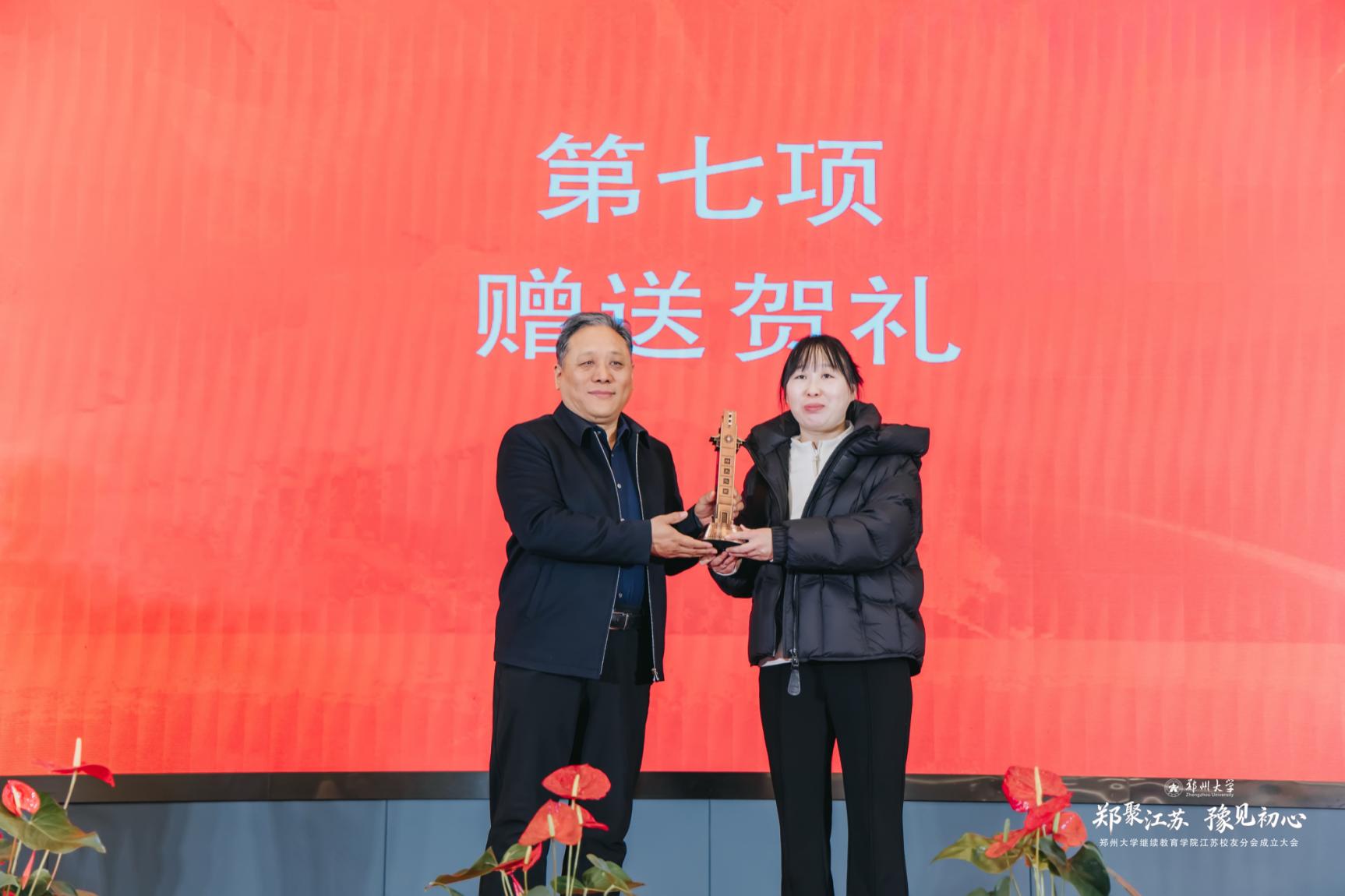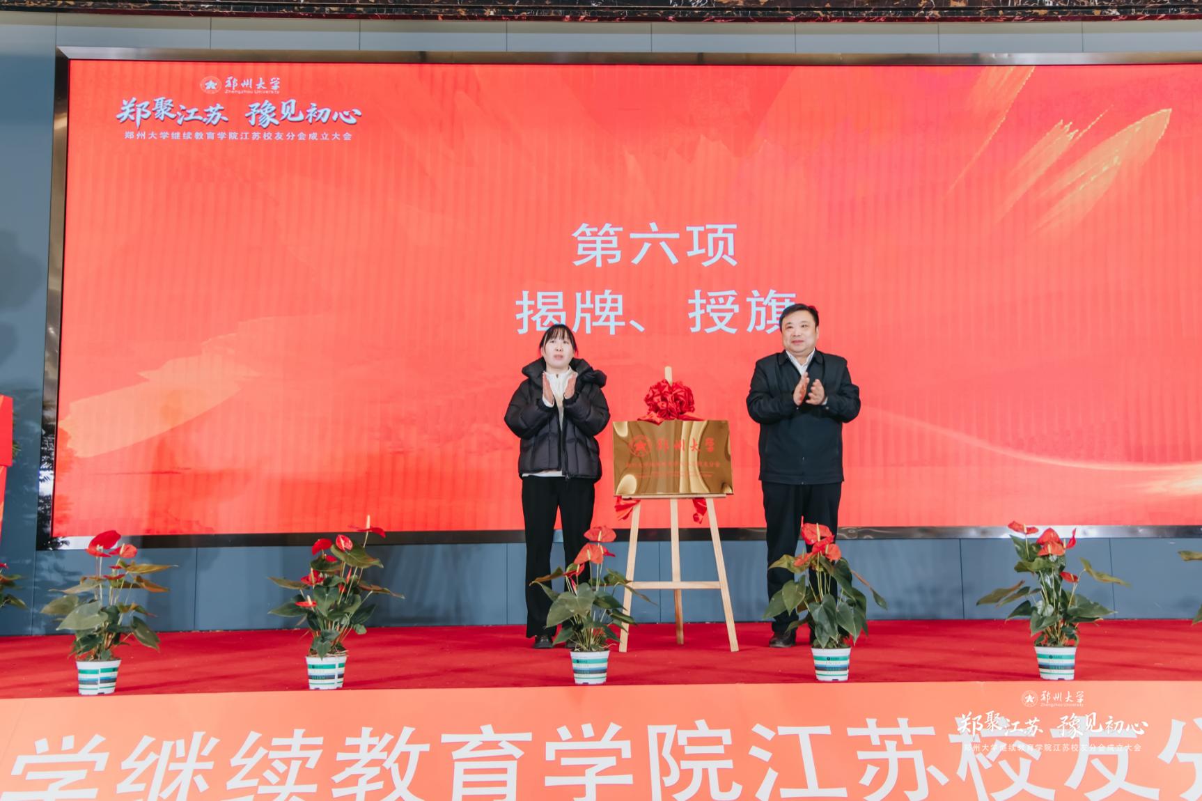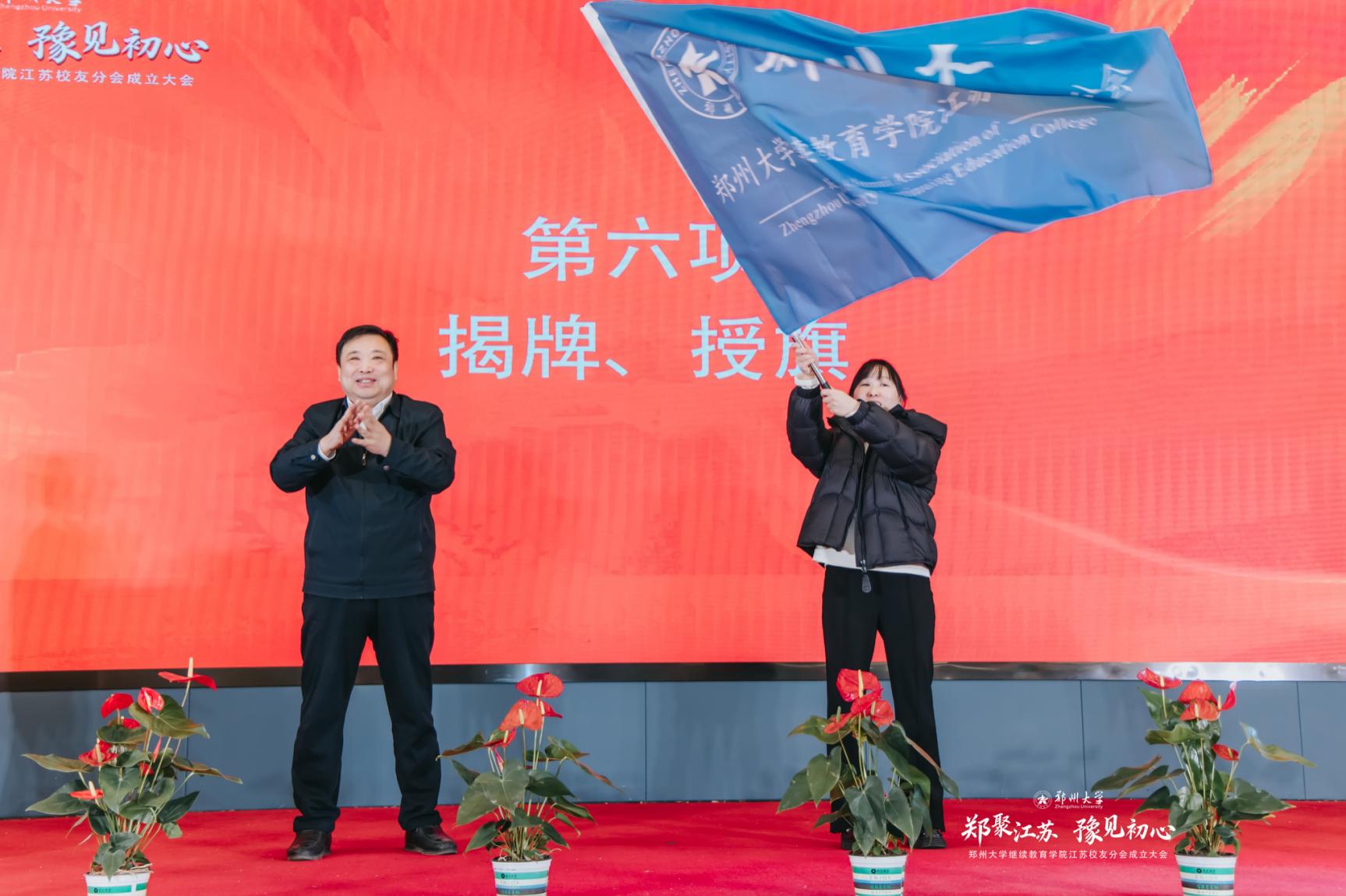 在经久不息的掌声中,胡少伟为学院江苏校友分会揭牌、授旗。李苏贵为学院江苏校友分会赠送校训纪念品。