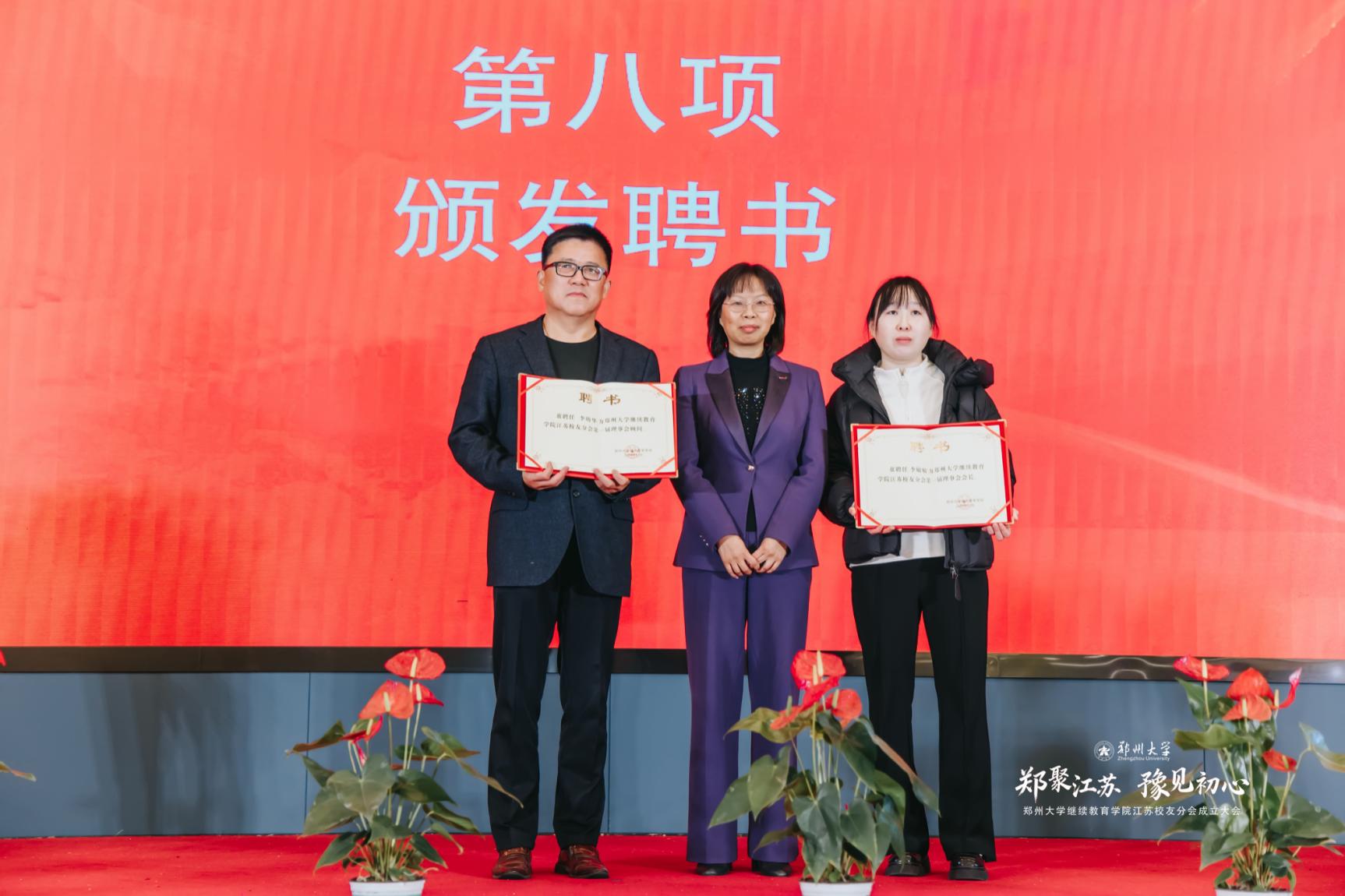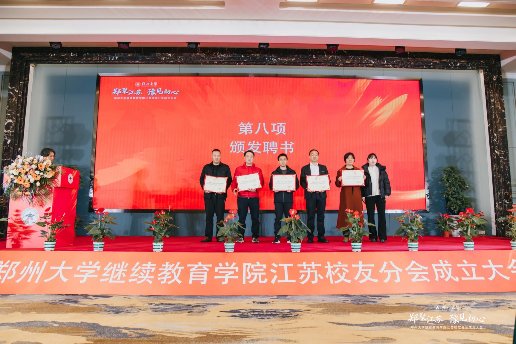 何玲玲为江苏校友分会顾问李幼华、会长李敏敏颁发聘书。新当选会长李敏敏为蒋群忠、李金波、沈琪、陈玲芳、缪林峰颁发副会长、秘书长、副秘书长聘书。