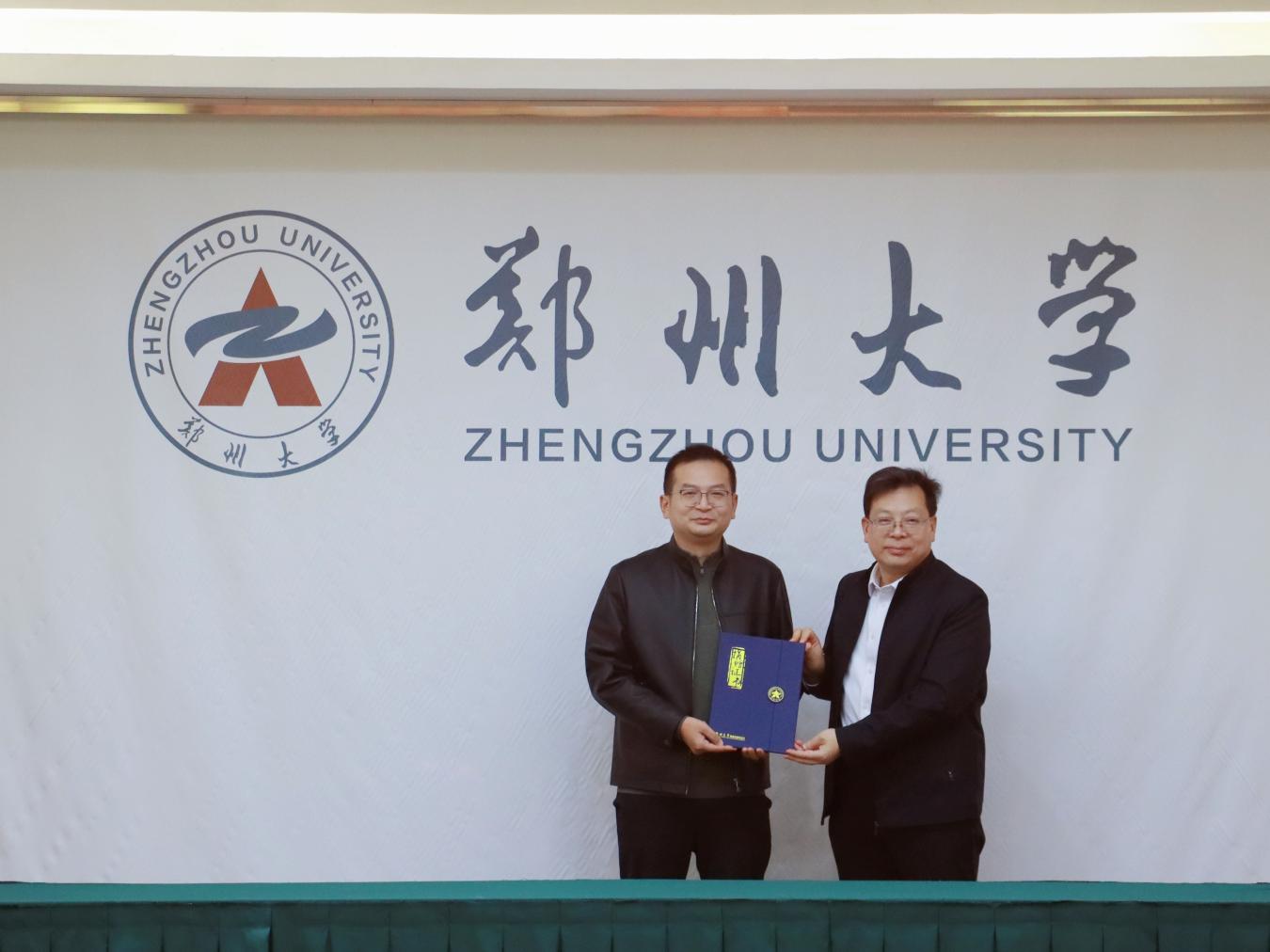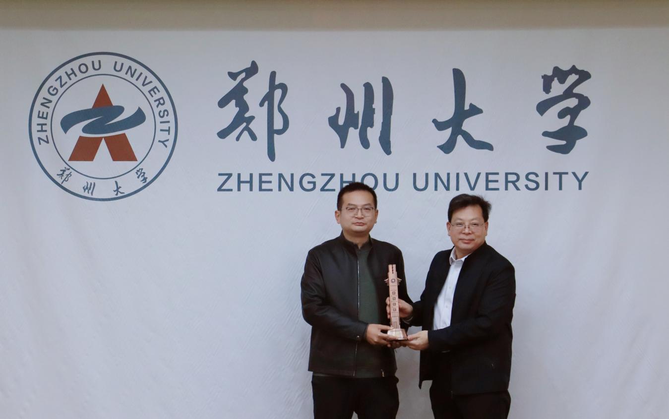 王利国向赵庆鹤校友颁发捐赠证书并赠送“郑大之星”校训纪念品。