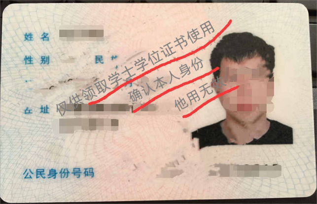上传的身份证正反面可参考下图做简单处理(将透明胶带粘贴在需标记处并做好文字标注)